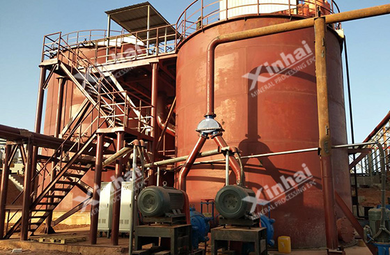 The underflow density of the thickener was concentrated to about 40%, which was pumped into the double impeller efficient leaching tank by the slurry pump for leaching and carbon adsorption. And the roots fan was used to fill the leaching tank with air, the NaCN was added at the same time to make the full reaction among slurry, reagent and air.