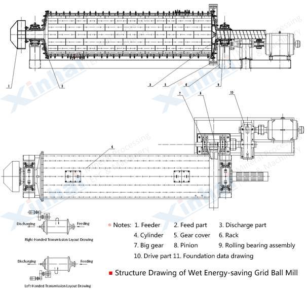 [Improvement]: Cylindrical energy saving grid ball mill is lined grooved ring plate which increases the contact surface of ball and ore and strengthens the grinding.