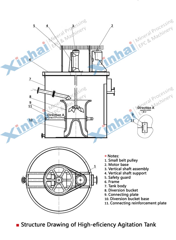 High efficiency agitation tank is mainly applied in slurry stirring before floatation, chemical and construction industry, cyanide chemical plant, sewage treatment plant, and coal plant etc.
