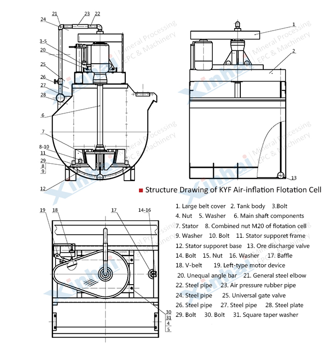 KYF air inflation floatation cell is applied in roughing and cleaning of large and middle scale dressing plant aiming to non-ferrous metal, ferrous metal and nonmetal minerals. The range of feeding particle size is 0.3~0.01mm (-0.0074mm contents > 50%)