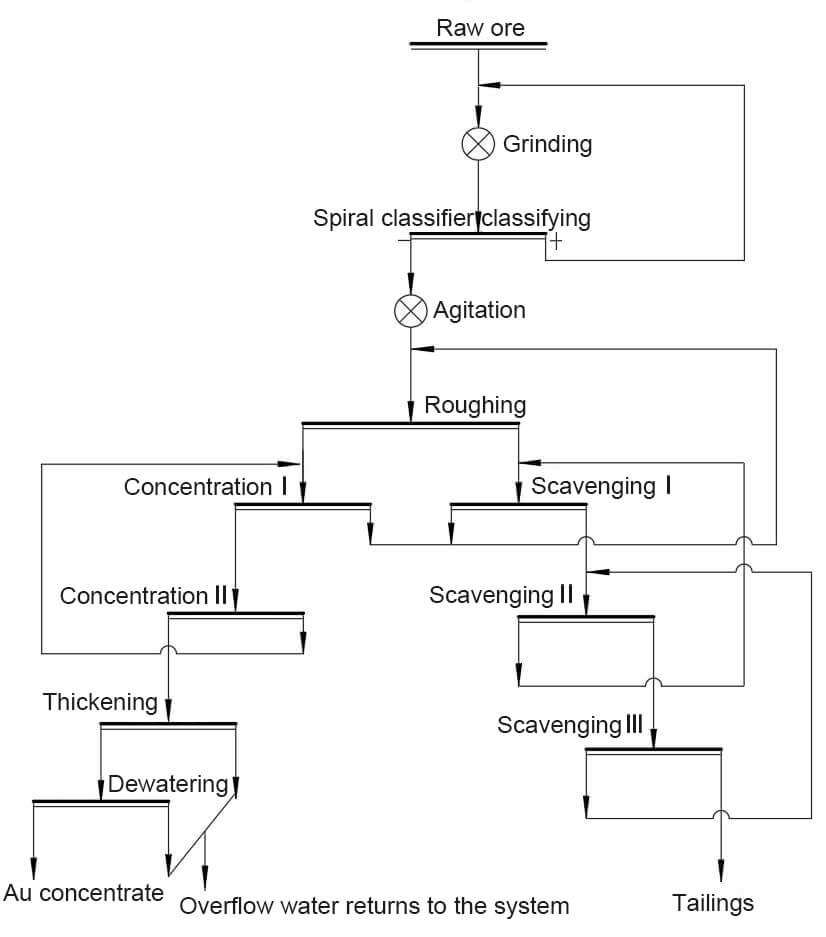 One-stage crushing-grinding and classifying-flotation (one-stage roughing, two-stage concentration and three-stage scavenging).