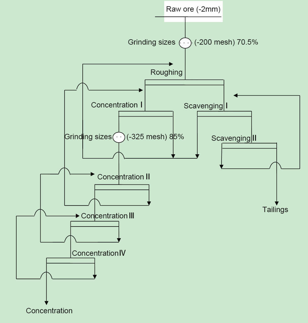 Through one-stage grinding, the fineness reaches -200 mesh 40%~70%. After flotation, the coarse concentrates are regrinded. The regrinding fineness is according to the monomer dissociation condition.