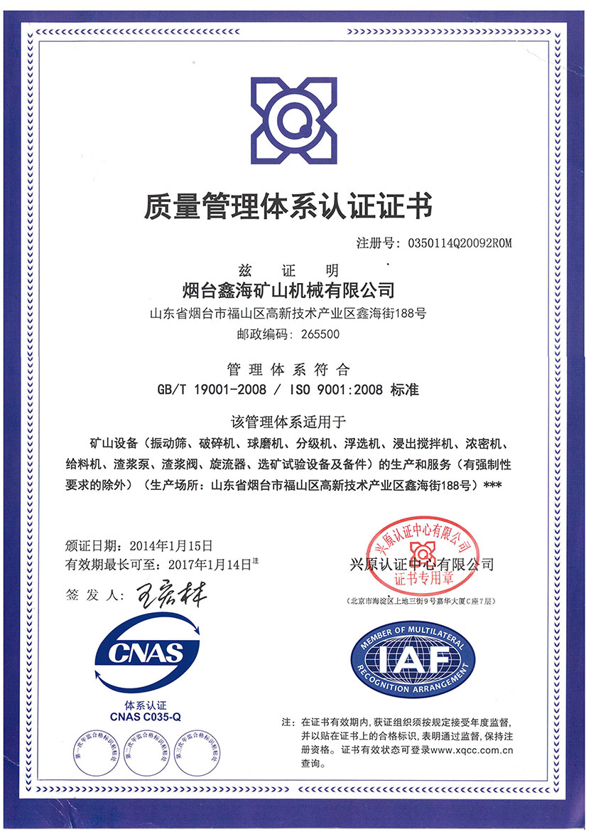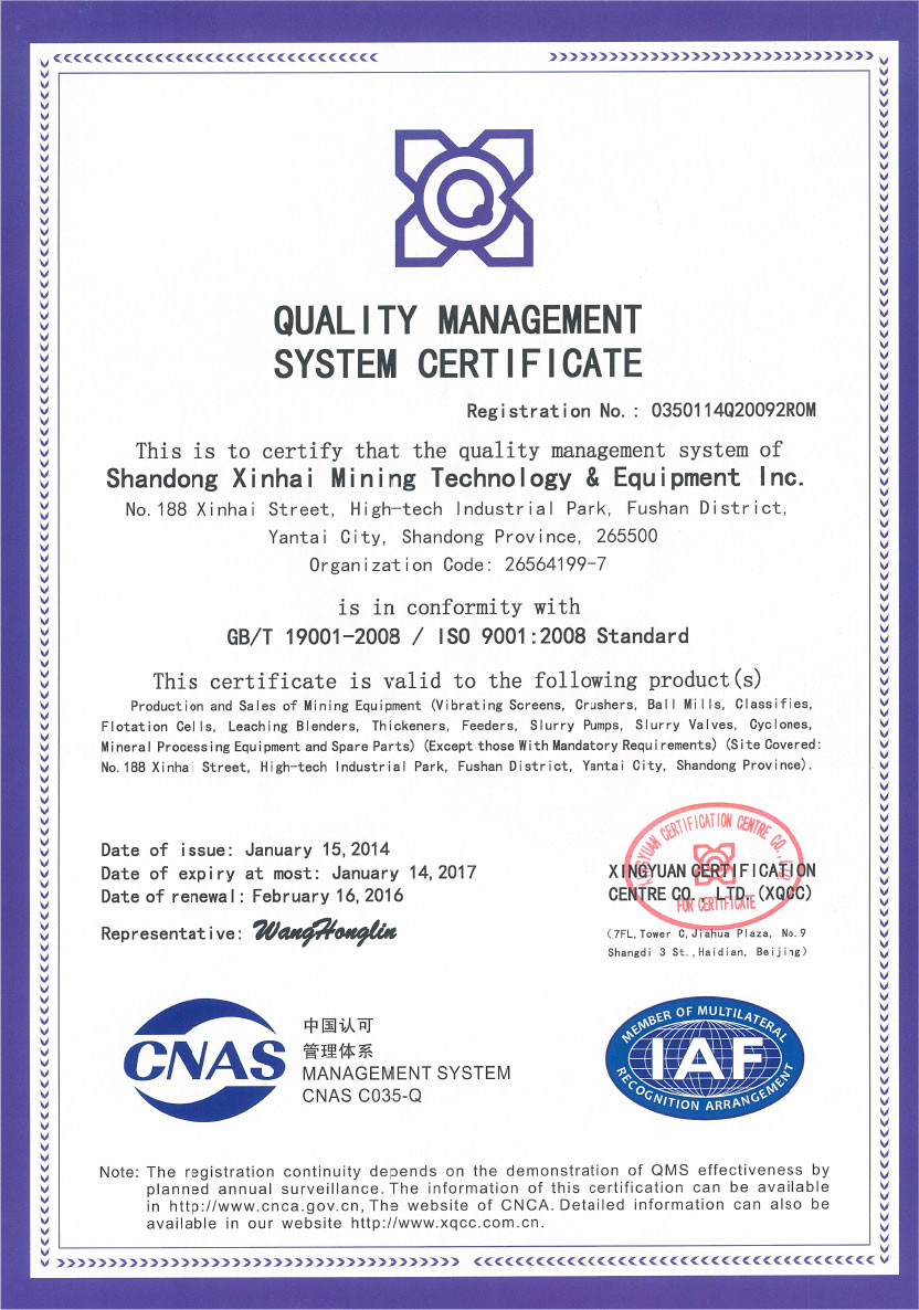 Xinhai Mining has got ISO9001:2015 quality management system certification with high quality products, and be classified as advanced products, standard quality and assured brand!