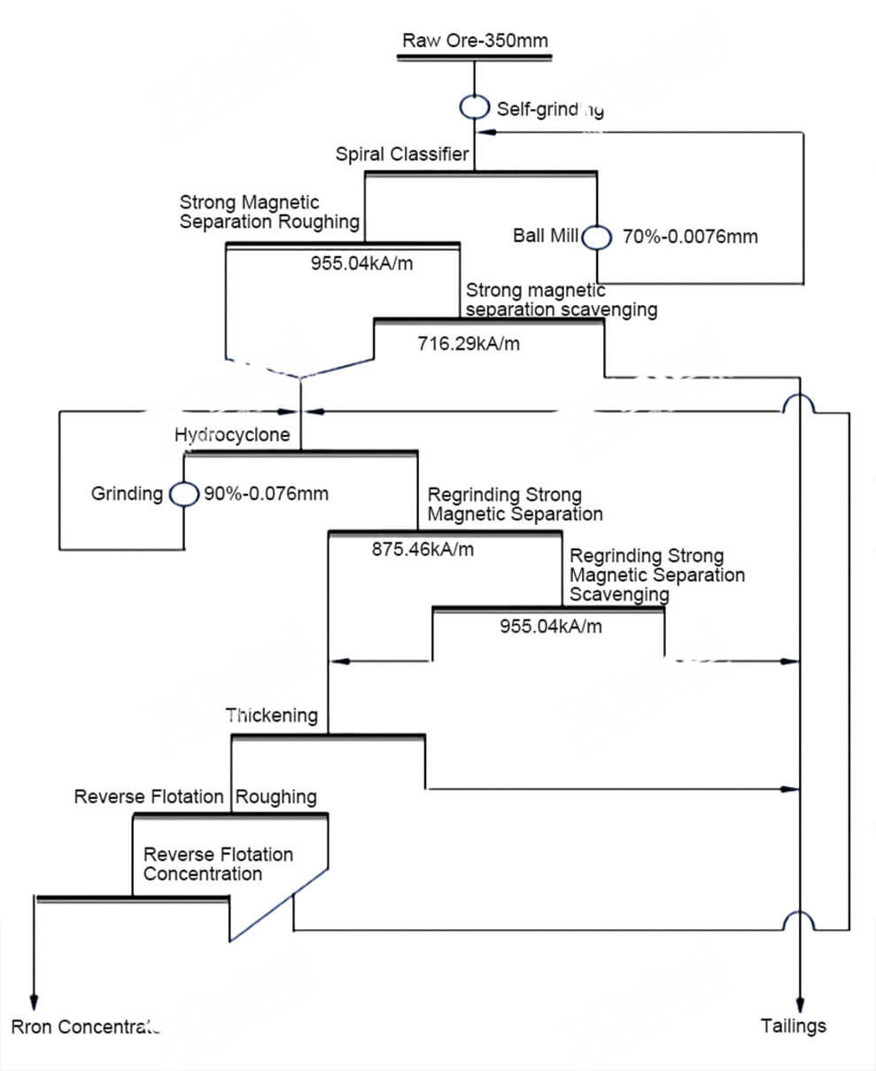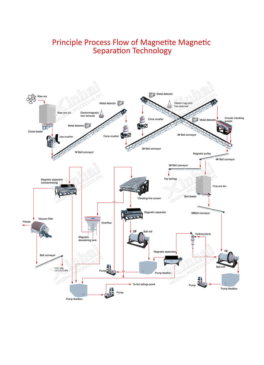 Process: Two-stage closed-circuit crushing and screening - two-stage closed-circuit grinding and classification - magnetic separation process of one-stage roughing and three-stage concentration - concentrates and tailings filtering and dewatering.