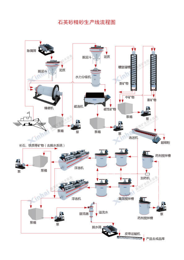 If there are many kinds of mica minerals in the raw materials, it is impossible to completely remove the impurities by only using the spiral chute. In addition, if the raw material still contains a certain amount of feldspar minerals with a specific gravity similar to that of quartz, the flotation process can be used to remove these impurity minerals. At the same time, when quartz minerals and gangue minerals do not reach a certain degree of monomer dissociation, it is necessary to increase the fineness of grinding.